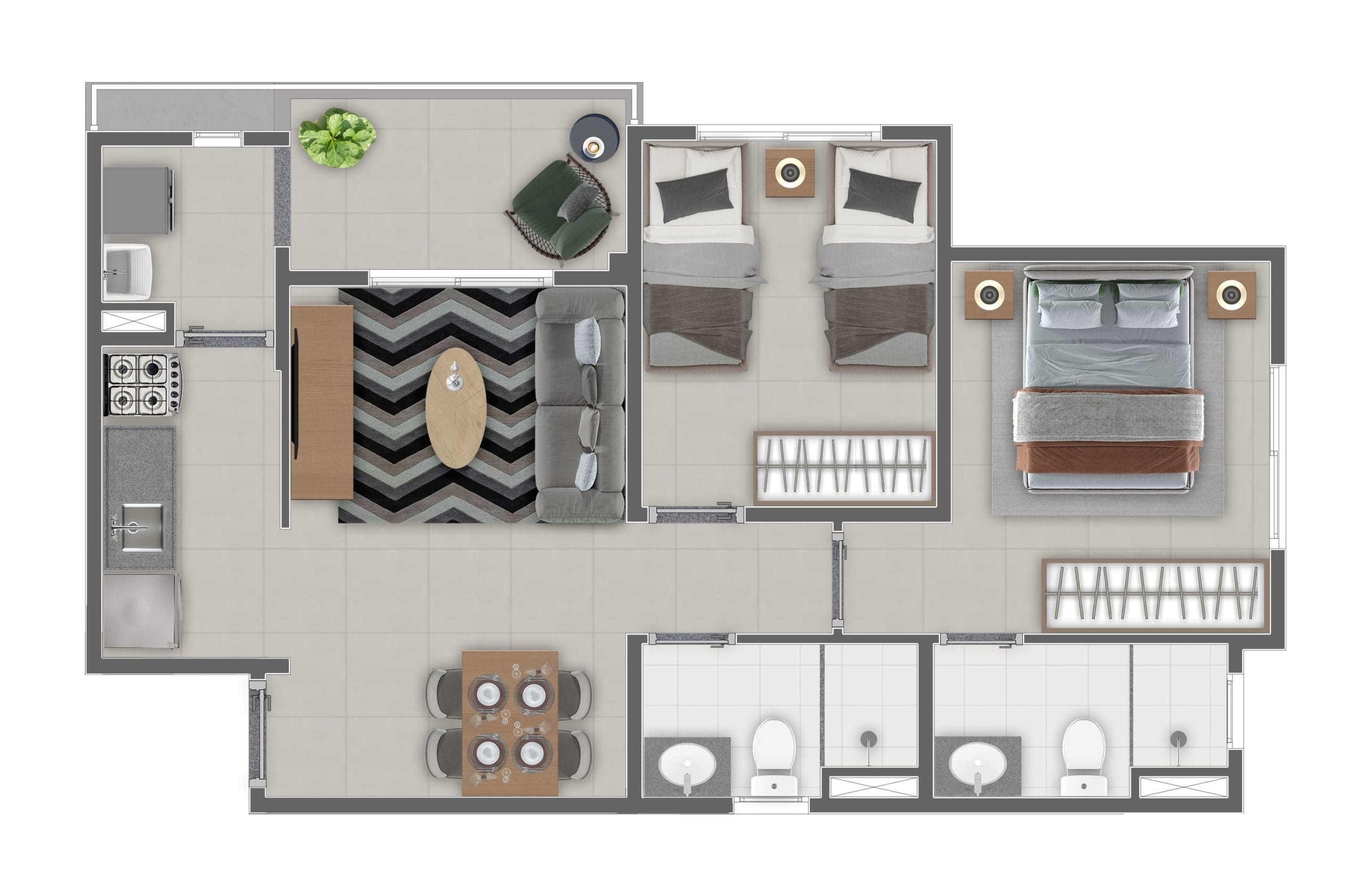 Apartamentos de 2 dormitórios e 1 suíte com plantas otimizadas nas metragem de 51 e 57m2.