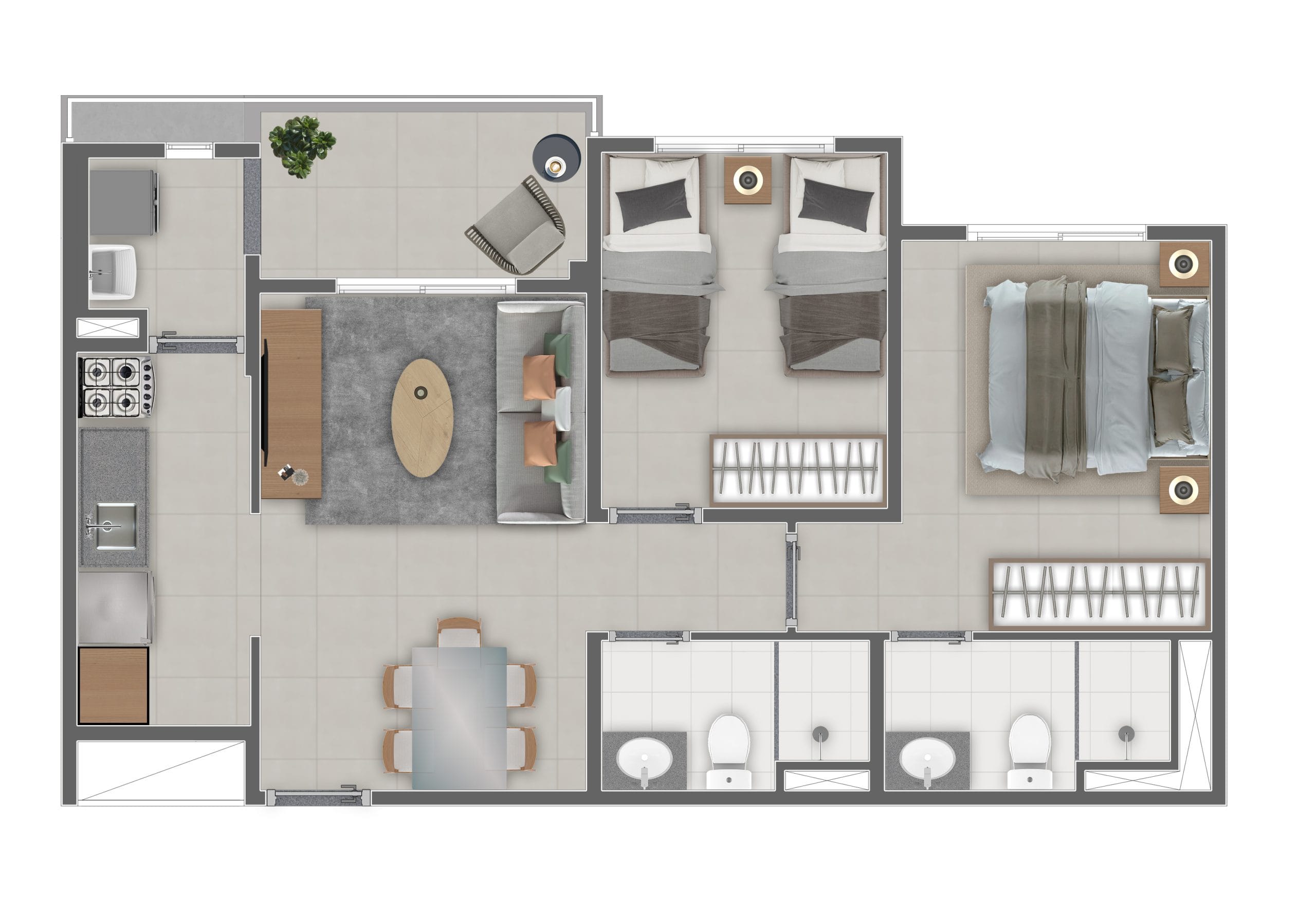 | Metragem | 51m² a 57m² |
